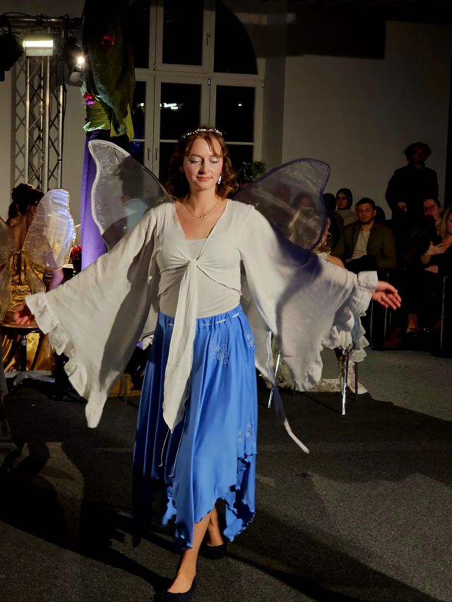 Die Bühne war weder Bühne noch Laufsteg – zumindest nicht am Anfang. Ein großer Saal, säulenbestückt, brandschutzoptimiert und so gar nicht modenschau-kompatibel. Doch die Schüler*innen verwandelten diesen Raum in ihr eigenes Wunderland. Konzept, Musik, Choreografie, Moderationstexte, Kostüme, Hairstyles – alles erdacht, entworfen, genäht, zusammengesetzt in 1,5 Jahren intensiver Arbeit.